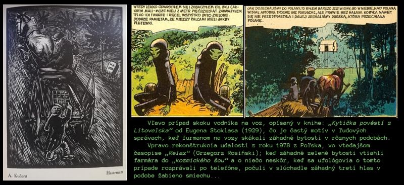 2. Od 4. minúty do približne 9. minúty v nahrávke zo 4. epizódy hovorí sa o chlapcovi, ktorý v potoku uvidel zvláštneho tvora v kombineze. Tento chlapec potom mal to, čo sa nazýva "missing time" = „chýbajúci čas". Z jeho života zmizlo 7 hodín (čo sa ešte stalo neskôr v budúcnosti po druhýkrát, že mal opäť ten chýbajúci čas). Tento prípad pripomína iné podobné stretnutia s bytostami, ktoré môžu mať rôzne podoby (= transformovať sa). Je to tak, že aj pri stretnutí s bytosťami z ľudových príbehov, stáva sa že ľuďom vted „chýba čas", pozemský čas, čo môže tiež naznačovať, že v blízkosti miest, kde sú takéto bytosti aktívne, môže čas plynúť inak... Stáva sa tiež, že na takýchto miestach dochádza k teleportáciam a prenosu na iné miesta... a) Na obrázku číslo 1 uvádzam preklad popisu z Poľska s podobným motívom, ktorý som dostal pred 11 rokmi... b) V tomto v slovenskom príbehu (= Epizóda 4) sa tiež spomína tajomné, zvláštne malé stvorenie v kombinéze v potoku. Zvláštnou „náhodou" sa najznámejší prípad UFO v Poľsku odohral 10. mája 1978 v Emilcine, keď na konsky voz farmára, naskočili zelené bytosti v kombinézach , ktoré ho odviedli k zvláštne vyzerajúcemu "vozidlu", ake farmárovi pripomínalo lietajúci autobus alebo stodolu, a ktorého interiér zapáchal sírou (!). Toto všetko sa objavilo v močaristých oblastiach blízko magického balvana s dierou, do ktorej sa zrejme kedysi vykonávali pohanské obety. Jeho otec počul z tohto balvana pred mnohými rokmi hlas a práve nad týmto balvanom zmizlo kyvadlo jedného z ufológov.