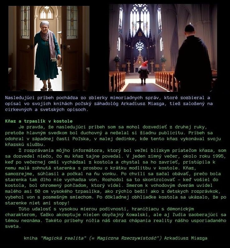 Záležitosti ktoré sú uvedené nižšie, sa môžu zdať šokujúce, ale informácie tu odhalené sa ukážu ako prekvapivo konzistentné, aj keď pochádzajú z rôznych častí sveta... 1. Najprv po analýze fotografií dá sa všimnúť, že objekt pravdepodobne nemal veľkosť auta (= ťažšie je odhadnúť veľkosť oproti oblohe), ale bol menší, možno okolo 1 metra, pretože na foto vyzeral ako tmavá bodka na oblohe, aj ked na jednej z fotografií je vpravo vidno osobné lietadlo. To znamená, že cez ďalekohľad na vzduchovke dalo sa vidieť detaily pri zväčšení 9x40, ale niečo o veľkosti auta zo vzdialenosti napríklad 200, 300 alebo 500 metrov, by človek mohol tušiť, že na fotografii bude lepšie viditeľné v detailoch. Inými slovami, tá záhadná "vec" ktorá letela, mohla byť menšia ako auto, čo by tiež zodpovedalo nasledujúcim bodom... 2. Tvor videný cez puškohľad sa prirovnáva k „Dedkovi Mrázovi" alebo „Santa Clausovi", t. j. jeho vzhľad pripomínal typického „škriatka". Navyše, tvor lietal v niečom, čo pripomínalo košík, a zvláštnou "náhodou" démonické čarodejnice v priebehu storočí - v Rusku Baba Yagy - boli zobrazované v takýchto predmetoch, čiže nielen na metlách, ale v niečom, čo vyzeralo ako iné domáce potreby, ako: kotly, veľké mažiare, sudy, maselnice atď. (obrazok 3) Na rozdiel od toho, čo sa zdá, ufológia aj dnes zaznamenáva tvory lietajúce vo vzduchu, s výzorom čarodejníc: https://www.youtube.com/watch?v=xQp5TQQVIcE 3. Premýšľal som, prečo tu na Slovensku škriatok bol v niečom, čo pripomínalo ten druh lietania, ako u čarodejníc. Je faktom, že čarodejnice a škriatovia sú si blízki v slúžbe silám temna, ale vysvetlenie môže zjavne zahŕňať niečo dodatočné: - spomenulo mi to príbeh poľského výskumníka záhad z juhovýchodného Poľska ktory sa vola Arkadiusz Miazga, a ktorý zaznamenal viac veľmi zvláštnych súčasných prípadov. V jednom z nich svedkom bol istý kňaz. Kňaz už zatváral kostol a vtedy chcela dnu vojsť nějaká stará žena. Kňaz ju pustil a čakal vonku, kým vyjde. Starenka dlho nevychádzala, čo kňaza znetrpezlivilo, a tak keď chcel vojsť do kostola; po otvorení dverí mu medzi nohy vybehla mala bytosť s typickým vzhľadom škriatka, a nahlas sa smiala, keď utekala preč. Kňaza to šokovalo. Záhadnej "stareny" samozrejme, už nebolo v kostole. Takže máme istú stopu k slovenskému prípadu v Poľsku: buď tam škriatok nadobudol podobu starej ženy, možno aj „baby jagy“, aby vošiel do kostola a urobil si z kňaza taký žart, alebo démonický tvor v podobe baby jagy vošiel do kostola, aby neskôr nadobudol podobu škriatka (!). To by tiež vysvetľovalo, prečo tu neďaleko Trnavy videli škriatka v „vozidle“ pripisovanom čarodejniciam... (!). Presný preklad popisu z poľskej knihy týkajúceho sa tohto prípadu je uvedený na obrázku 4.