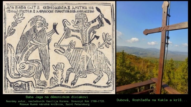 7. Je náhodou, že na druhej strane Karpát, pani Marie Korandová vo svojej knihe „Povesti a príbehy z kopaničiarskeho kraja" opisuje miestne záhadné správy, okrem iného aj o aktivite „Baby Jagy" (!), ktorá sa mala objavovať v oblasti jednej z lúk pri Branči? 8. Je náhodou, že krkonosky duch hor keltského pôvodu, vedel sa podobne premeniovať? Josef Virgil Grohmann v knihe "Pověsti z Čech" pisal o niom že dokazal sa premeniť rýchlo na čokoľvek, objaviť sa ako muž s dlhými fúzmi, ako lovec alebo v rúchu mnícha. Inokedy na seba vzial podobu, kohúta, krčiacej sa vrany, divého koňa, nepríjemnej žaby, kozy, netvora chrliacieho z úst ohnivé gule, alebo v podobe škriatka (!) V hrozivejšich podobach ukazoval sa ked niekto si z neho robíl srandu alebo ho urazíl. 9. V súvislosti s vrchom Kukla, vzdialeným 20 kilometrov, staré záznamy hovoria aj o pôsobení klamlivých síl v tejto oblasti, a to aj v podobe svetelných gúľ... Je náhoda, že v roku 2021 v lesoch nad obcou Dubova, neďaleko Kukly, mladí ľudia mali vidieť strašné ženské božstvo jazdiace na diviakovi, čo je v súlade s vyobrazením Baby Jagy sediacej na démonickom diviakovi, na ruskom obraze z obdobia medzi rokmi 1700 a 1725? (obrazok 5) Je náhoda, že Karpaty v Trnavskom kraji, až po Bratislavu majú množstvo keltských hradísk a pozostatkov - a že pohanské božstvo Keltov malo vo svojom panteóne bohyňu Arduinne, označovanú ako „bohyňa diviakov"? Je náhoda že Moccus, ktorý bol stotožňovaný s rímskym Merkúrom, bol zároveň keltským božstvom-diviakom? Alebo Teutates, ktorý sám niekedy nadobúdal podobu diviaka?